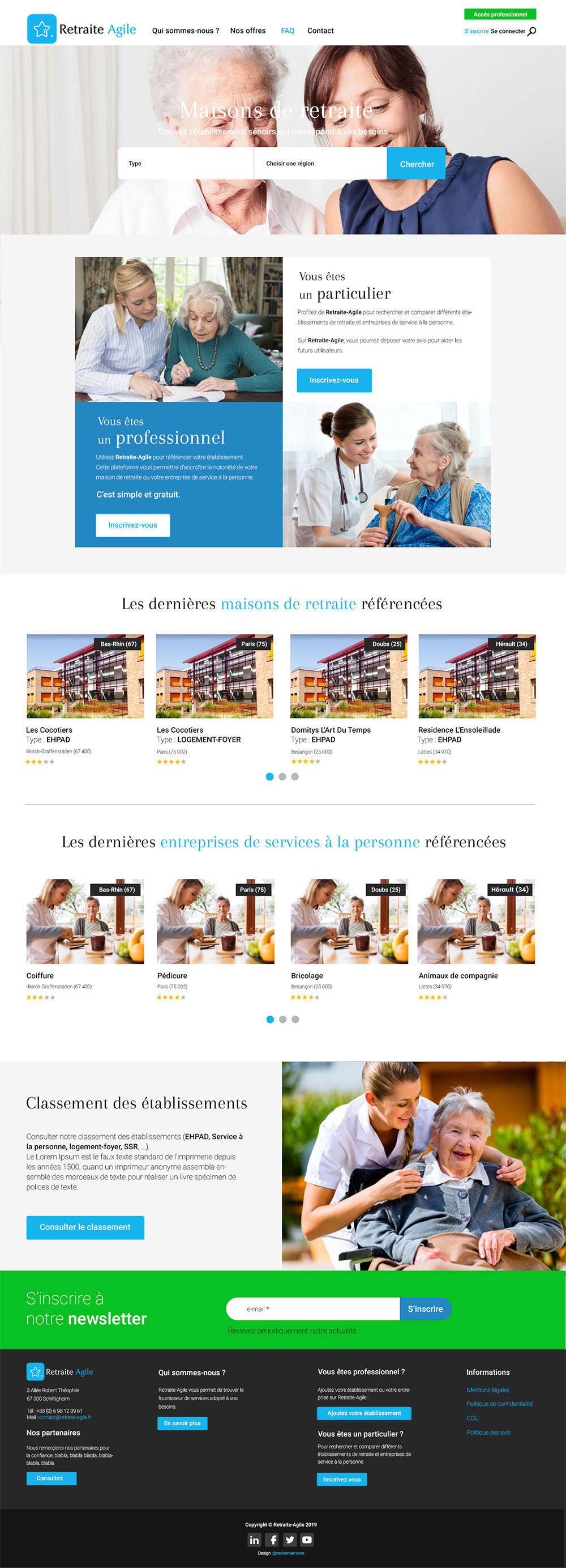 Proposition de maquettes, de wireframes et UI. Retraite Agile a pour objectif de référencer les EHPAD, Logements foyers, ... ainsi que les entreprises de services à la personne à travers la France.